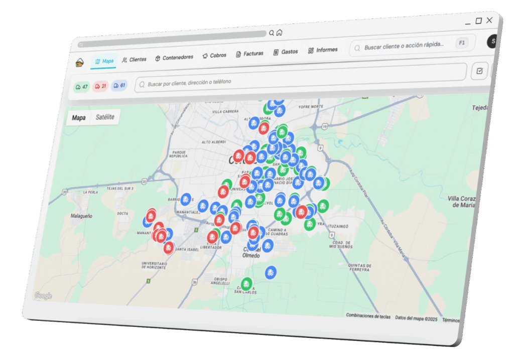 Ves tus contenedores en el mapa y actualizás estados en segundos. Pedidos, clientes y facturas quedan en un mismo lugar.